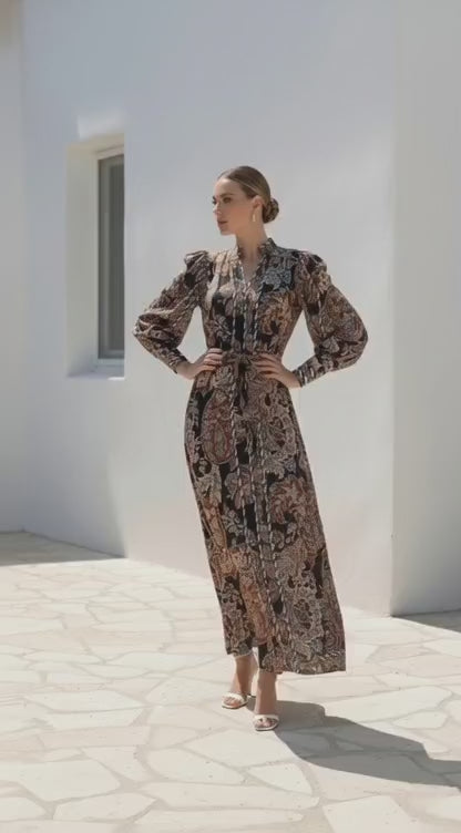 Indulge in luxury with our Marbel Long Dress in rich brown! Adorned in a captivating paisley print, this flowing maxi dress exudes elegance with its long sleeves, flattering v-neckline, and cinched waist. The intricate pattern and luxurious fabric make it a statement piece for any special occasion. Embrace your inner fashionista in this one-of-a-kind dress.
