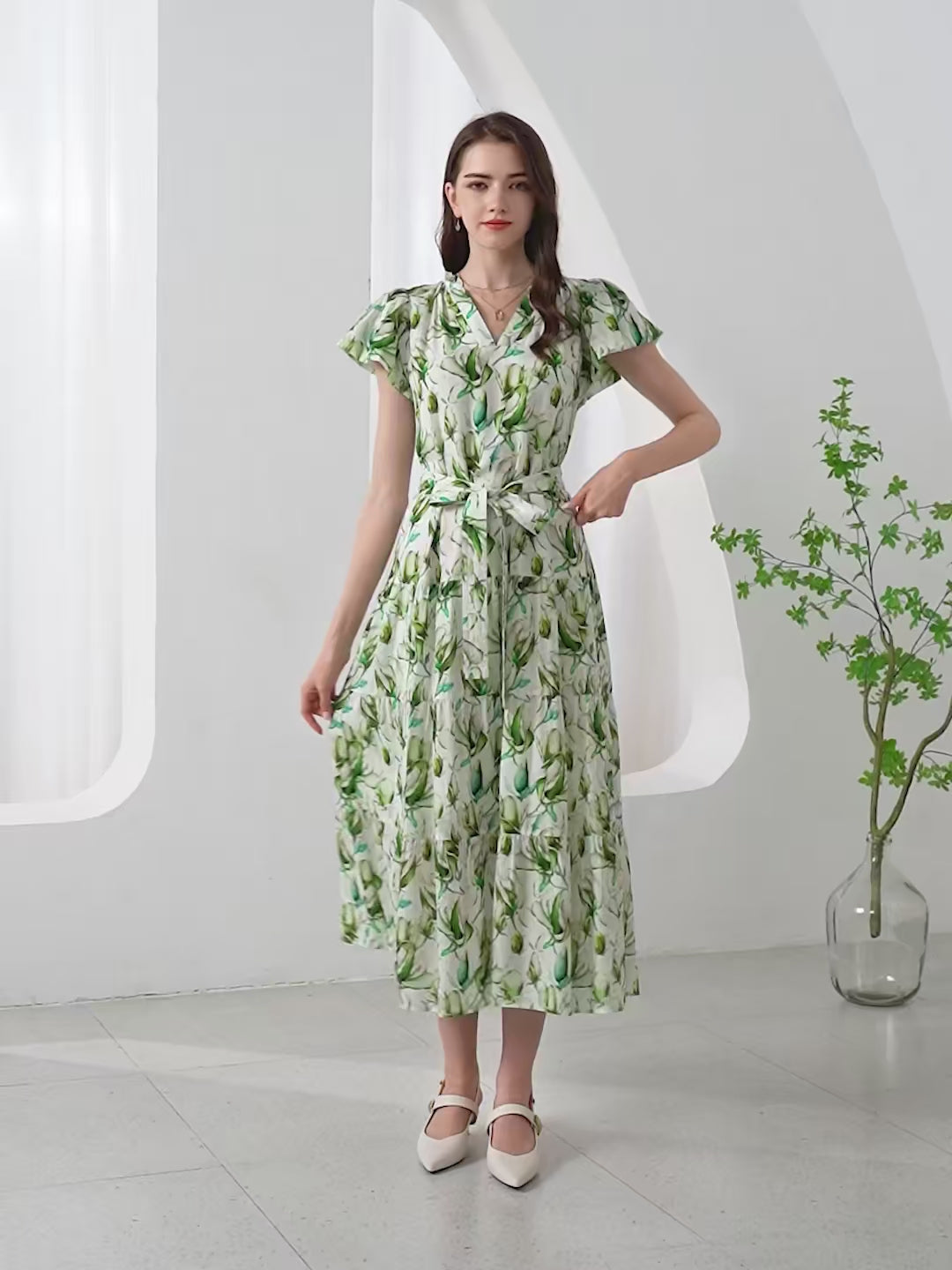 Embrace the beauty of nature with the elegant Risette Tencel Long flowy Dress, showcasing a captivating floral print that radiates vibrance and charm. The dress features a flattering v-neckline, delicate cap sleeves, and a self-tie belt that adds a touch of elegance while allowing for a perfect silhouette. - lined