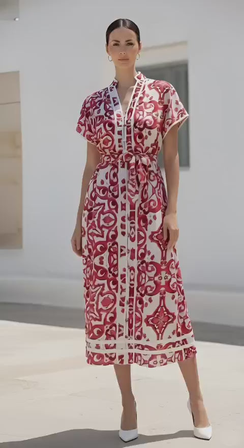 Elevate your wardrobe with the Estelle Dress in Pink—a sophisticated piece that commands attention wherever you go. The eye-catching geometric print paired with a graceful, flowing silhouette creates an instantly polished look that works beautifully for both leisurely escapes and special occasions.