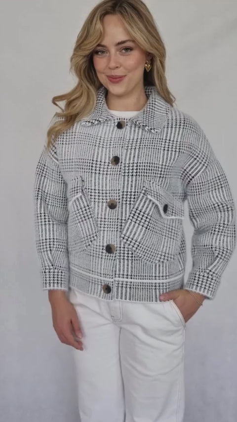 Introducing the Swiss Alps Jacket in Black and White. This unique and chic two-tone check jacket offers a modern twist on classic tweed. The relaxed fit and button-front closure provide both comfort and style, while the subtle black and gray glen plaid pattern adds a sophisticated touch. With its versatile cropped length and practical patch pockets, this jacket is the perfect addition to any wardrobe. Elevate your look with this exclusive piece.
